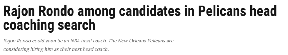 北京时间4月27日,据NBA记者马克-斯坦恩消息,新奥尔良鹈鹕队正认真考虑聘请NBA后卫拉简-隆多出任球队主教练,隆多也是该职位的潜在候选人之一。